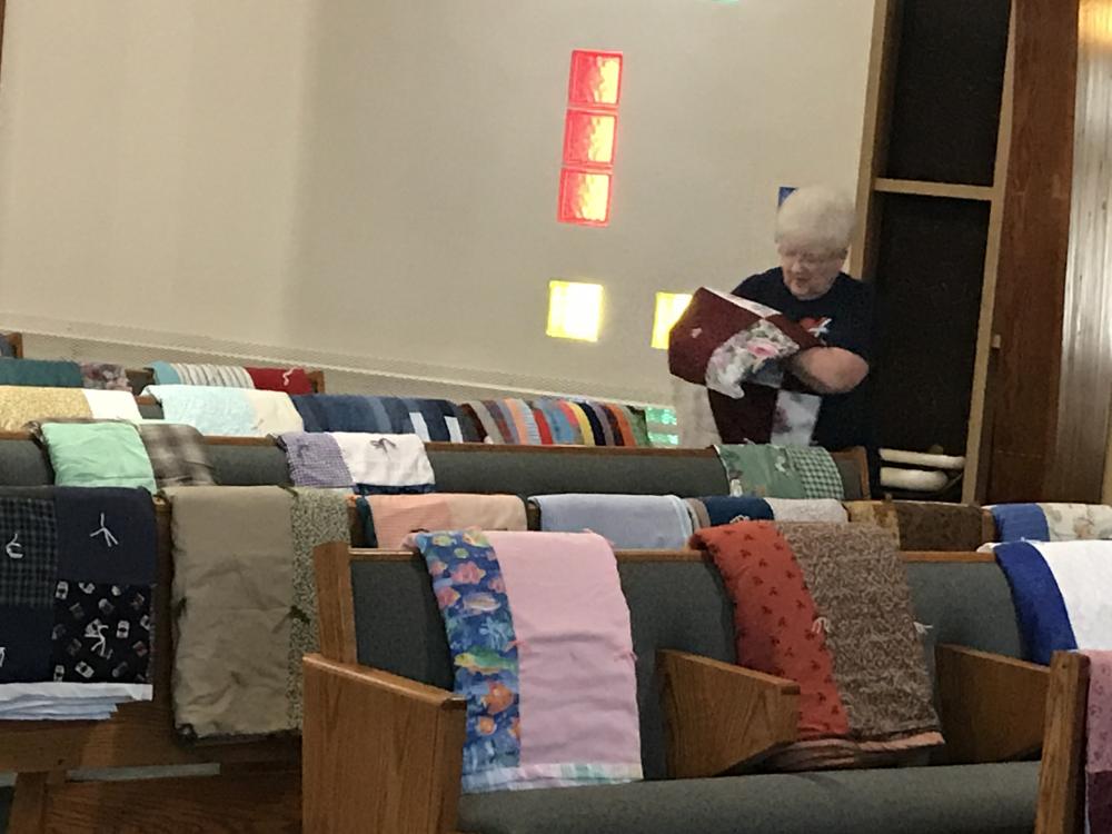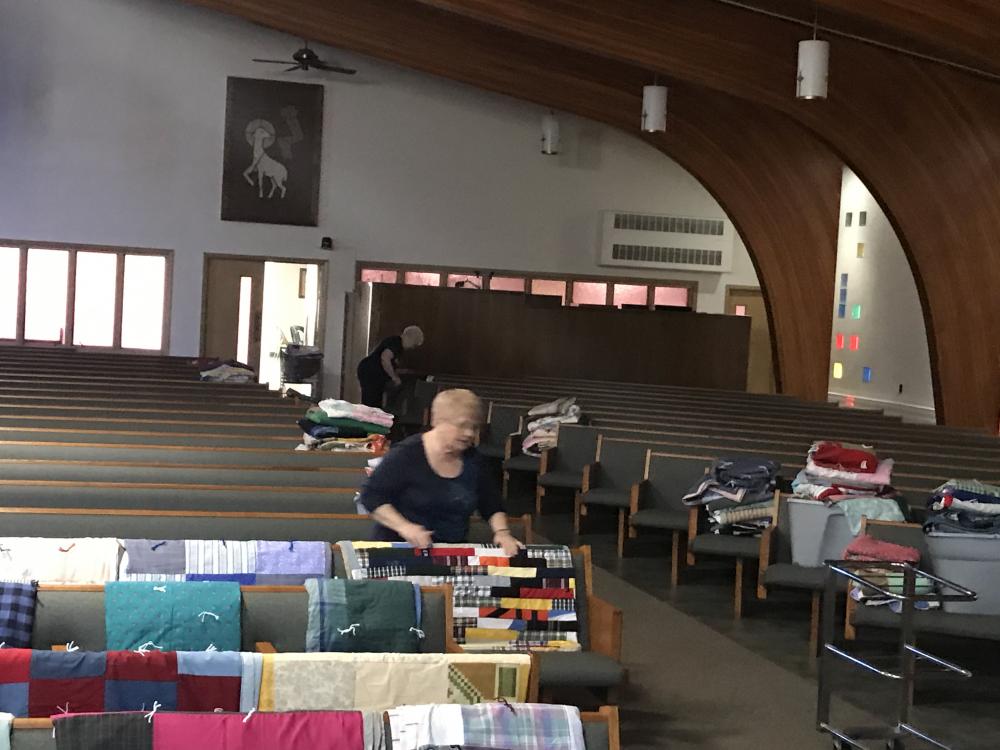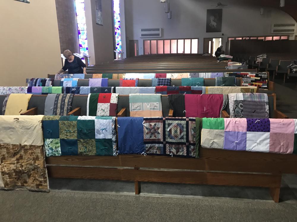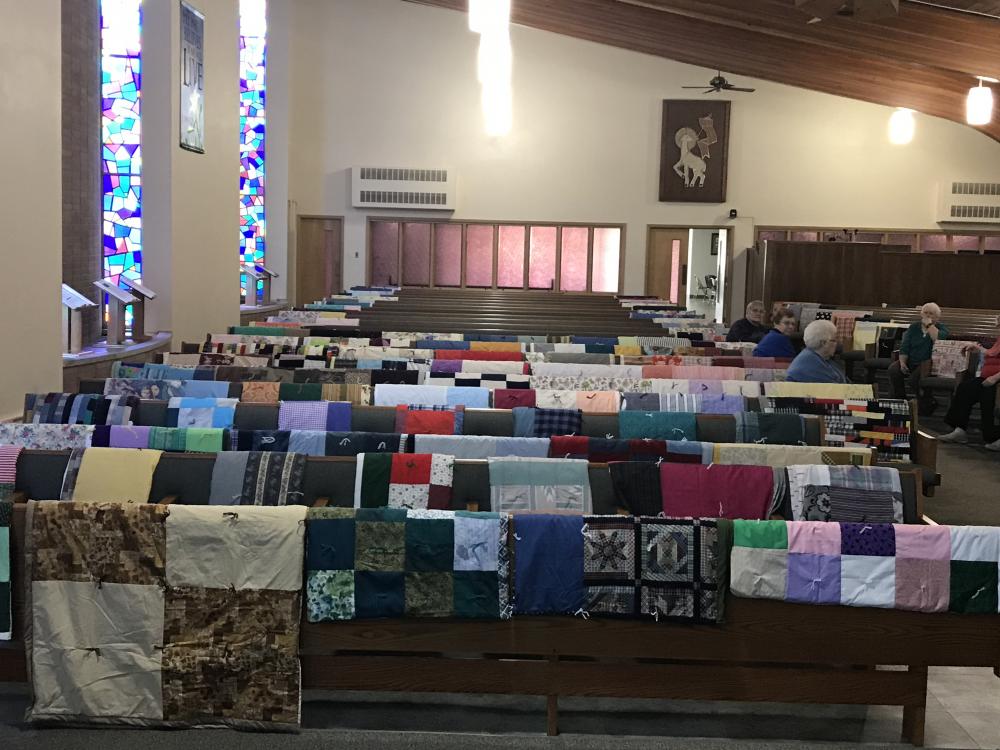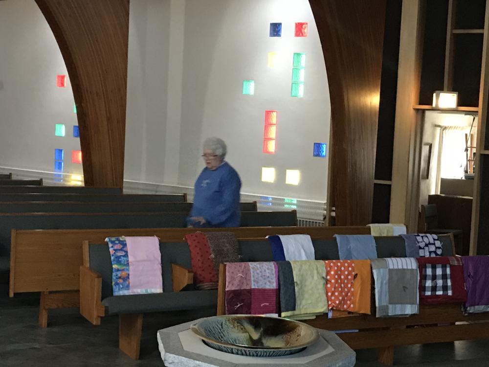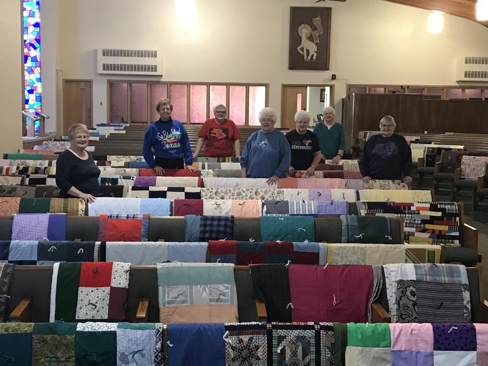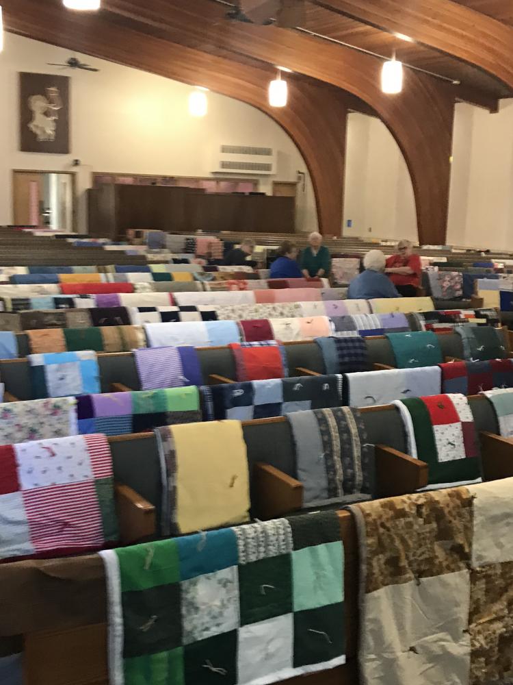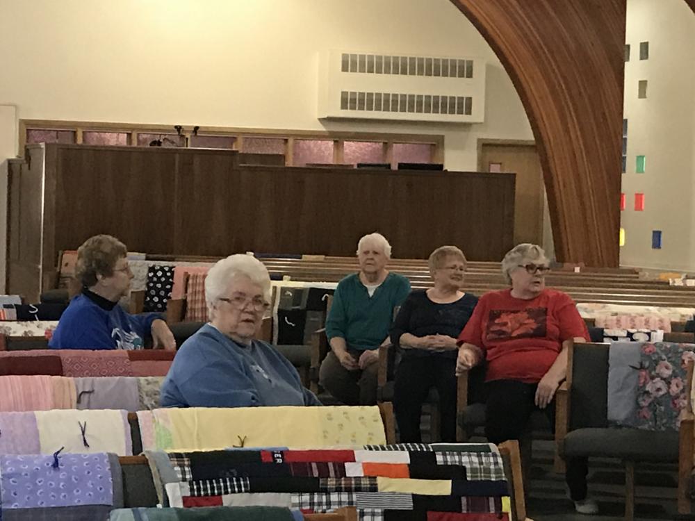 Every Thursday afternoon (1:00 - 3:00 p.m.) from September through May (with December off) several joy-filled, hard-working ladies gather to assemble quilts. It's a wonderful time of fellowship and productivity.