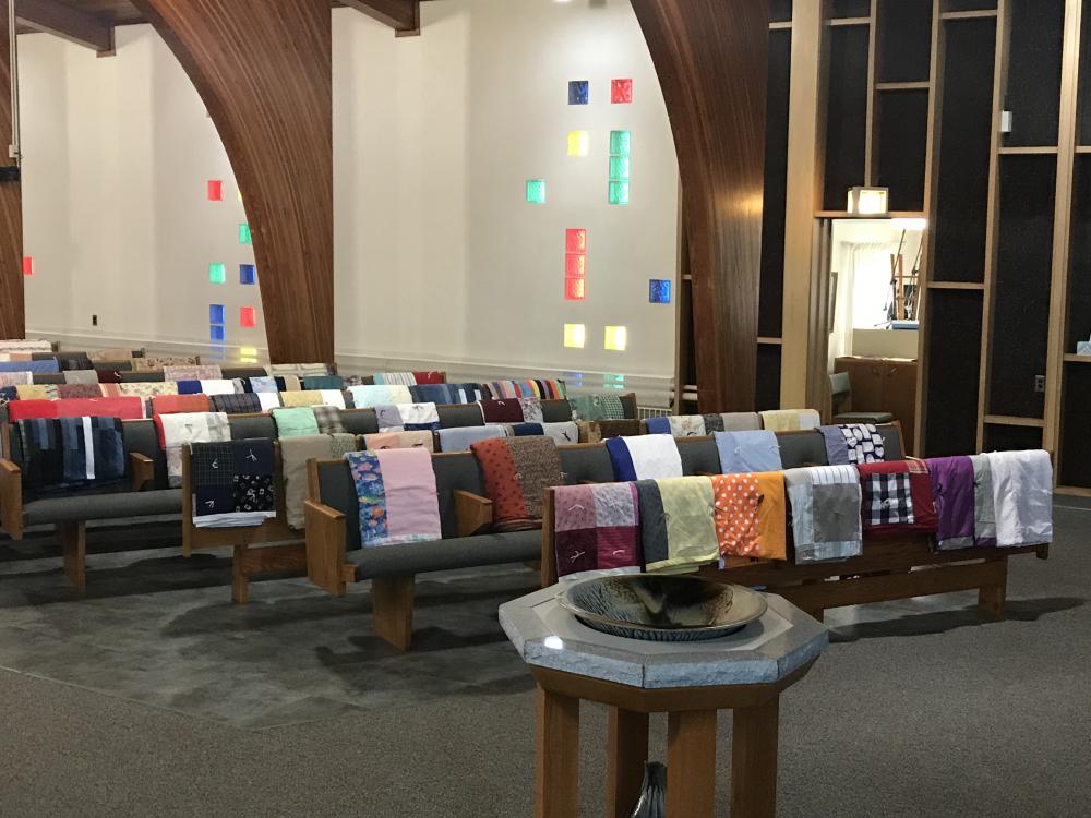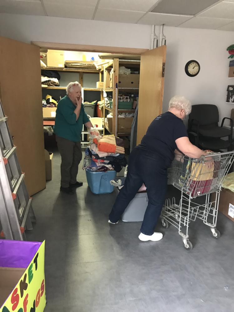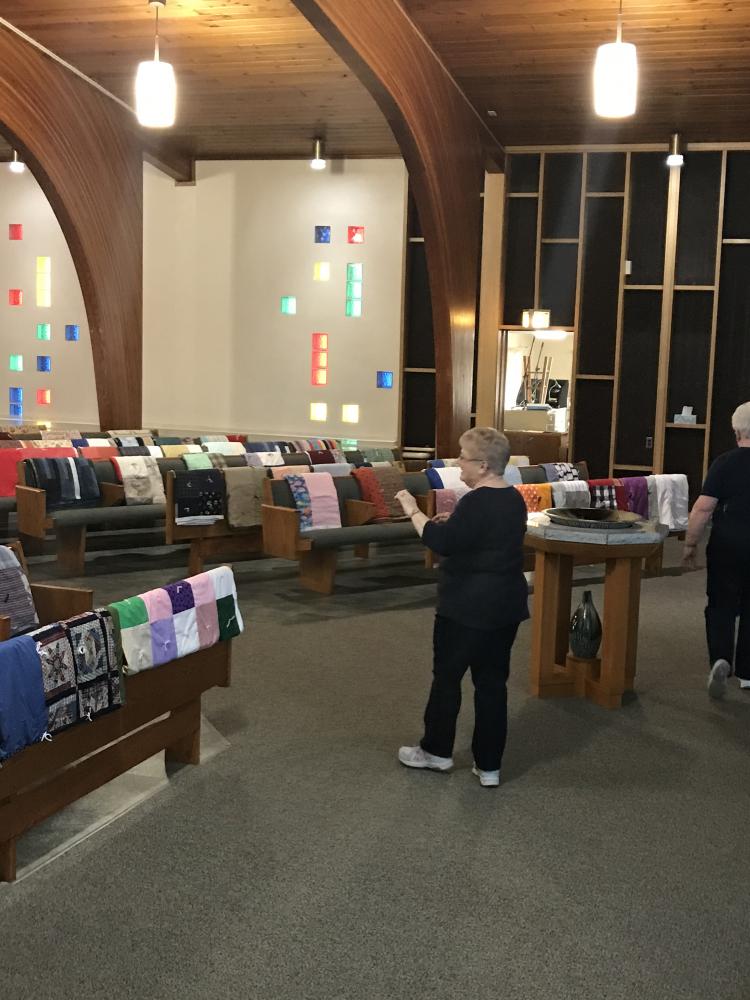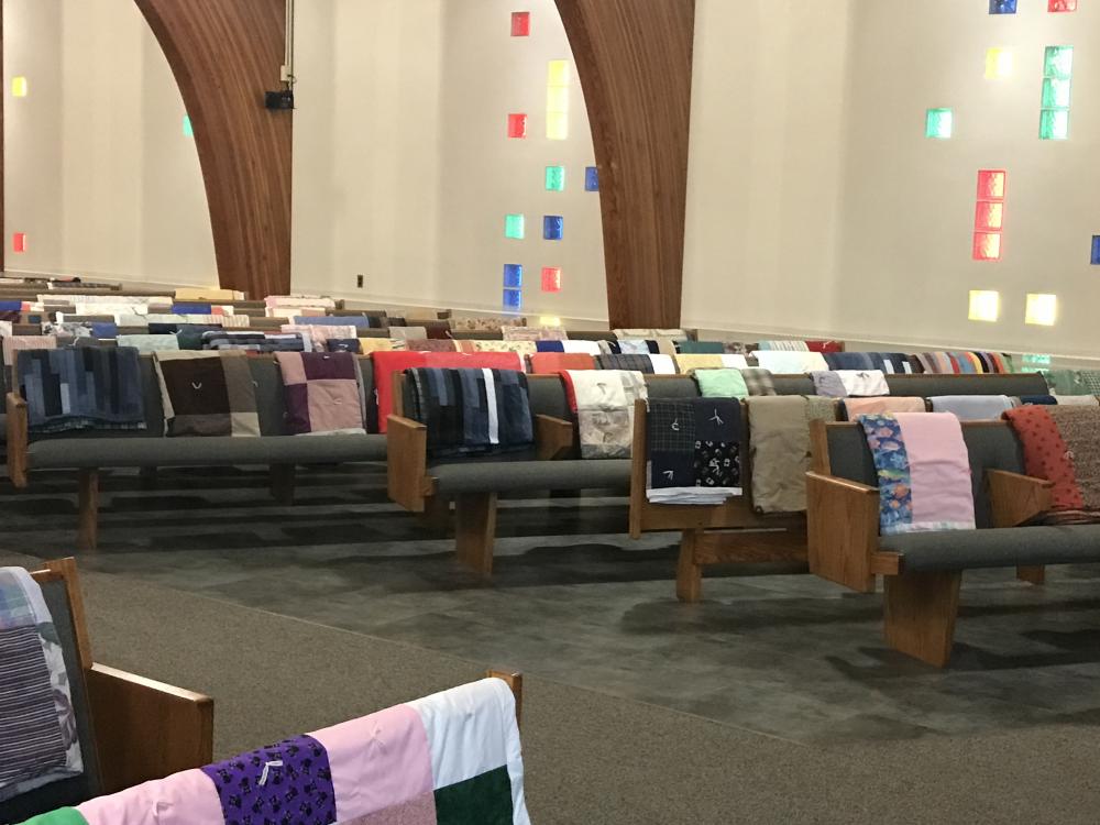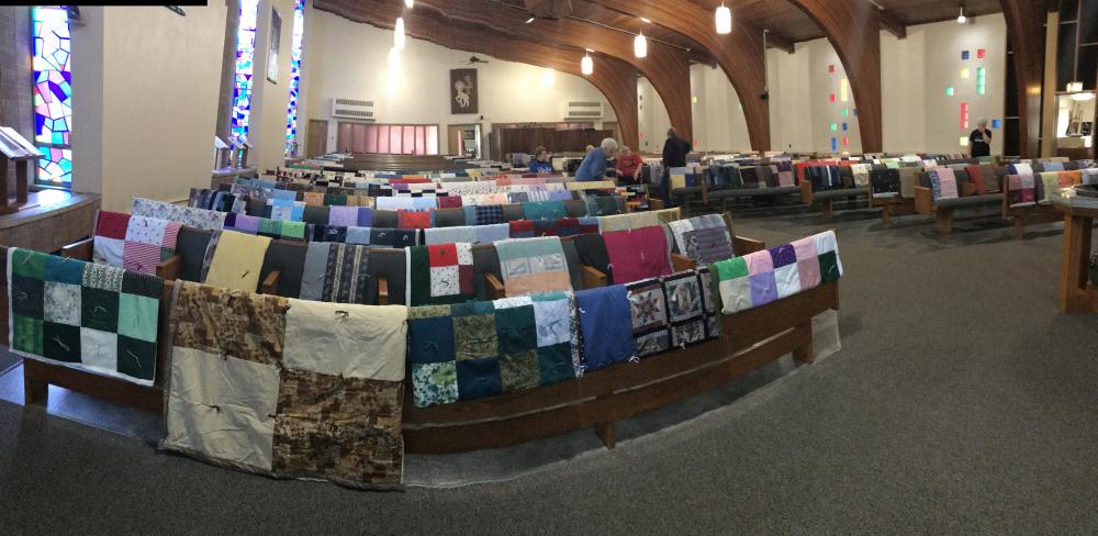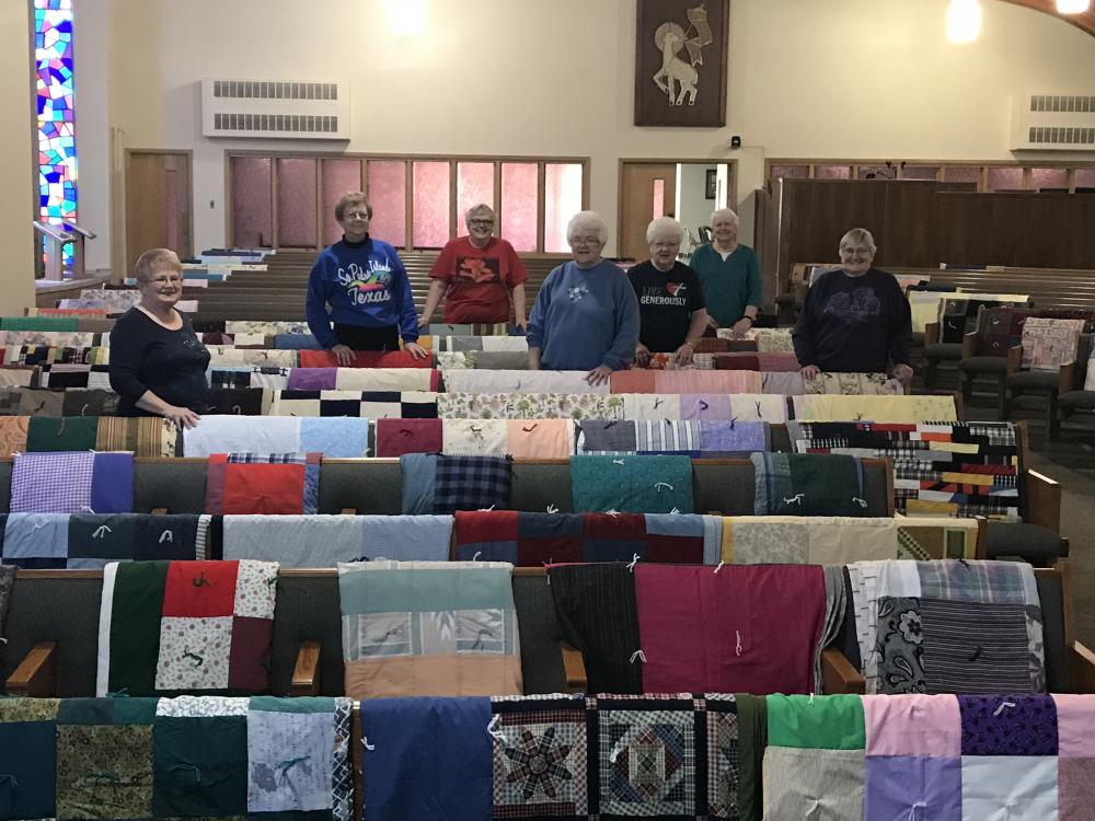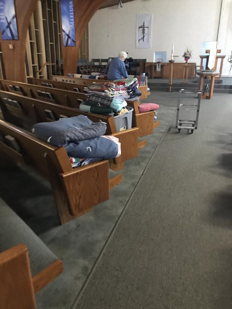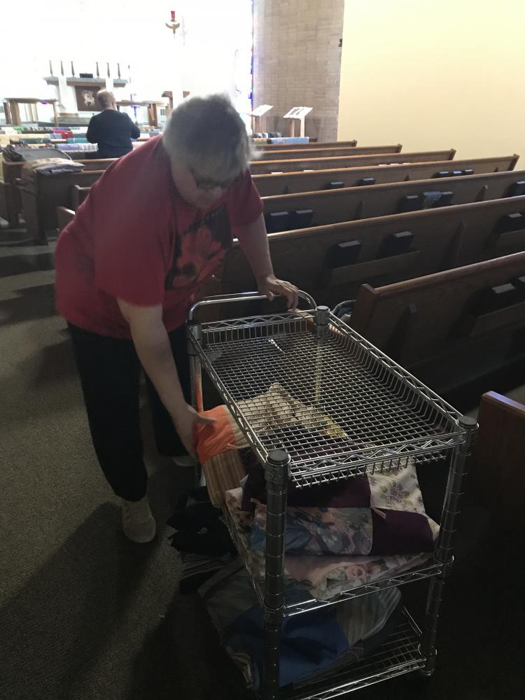 Every Thursday afternoon (1:00 - 3:00 p.m.) from September through May (with December off) several joy-filled, hard-working ladies gather to assemble quilts. It's a wonderful time of fellowship and productivity.